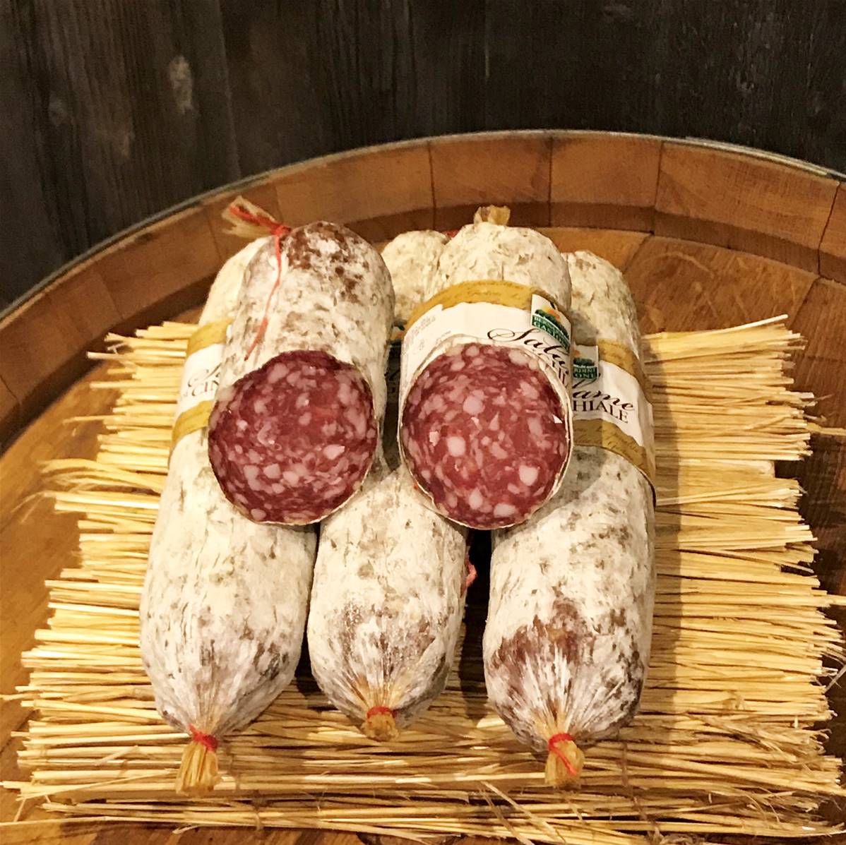 Saucisson composé d'un mélange de viande de porc et de sanglier qui apporte plus de caractère.